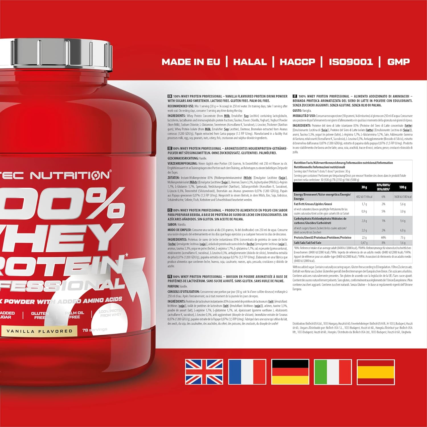Scitec Nutrition’s 100% Whey Protein Professional is a premium whey blend designed to support muscle growth, recovery, and daily protein needs. This 920 g tub in smooth Vanilla delivers a high-quality mix of whey concentrate and whey isolate, offering fast absorption and a rich amino acid profile to fuel your training. It mixes easily, tastes clean, and fits perfectly into any fitness routine whether you’re building muscle, staying lean, or simply boosting your daily protein intake.