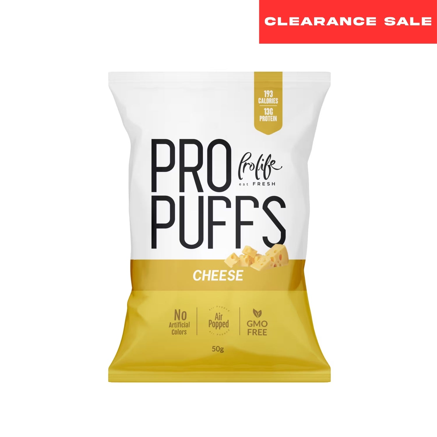 Prolife Pro Puffs Cheese (50 g) is a crunchy, air-popped puffed snack enriched with 13 g of protein per pack and delivering approximately 193 kcal.