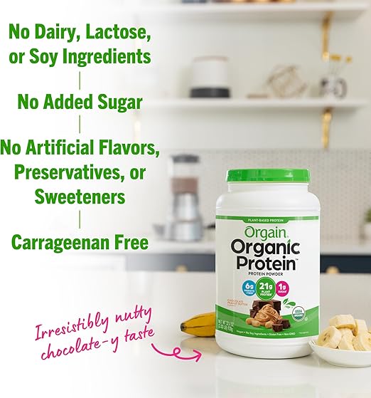 Fuel your day with clean, plant-based nutrition from Orgain Organic Protein Powder in delicious Vanilla Bean flavor. Each serving delivers 21 g of organic plant protein with less than 1 g of sugar and only 150 calories, making it a perfect choice for smoothies, shakes, or baking. Crafted for a creamy texture and smooth taste, this vegan formula is USDA Certified Organic, gluten-free, soy-free, and non-GMO. Ideal for post-workout recovery, meal replacement, or a nutritious on-the-go boost.